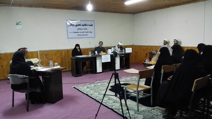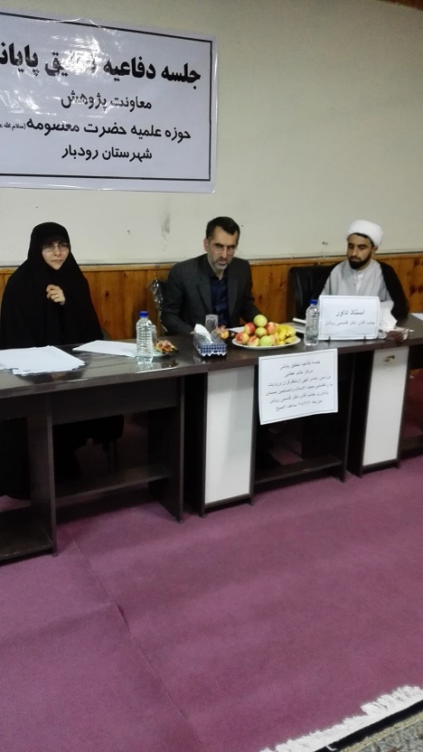 به حول وقوه الهی ،اولین جلسه دفاعیه حوزه علمیه حضرت معصومه (س)رودبار روز یکشنبه 7/6/95راس ساعت 9صبح باحضور کلیه اساتید راهنما، طلاب و خبرنگار هفته نامه شکوفه های زیتون برگزار گردید.در این جلسه سرکار خانم زهرا عطایی از تحقیق پایانی خود باعنوان (بررسی رضای الهی ازمنظر آیات وروایات )به راهنمایی حجت الاسلام والمسلمین جناب اقای صمدی وداوری جناب آقای قاسمی روشن دفاع نمودند