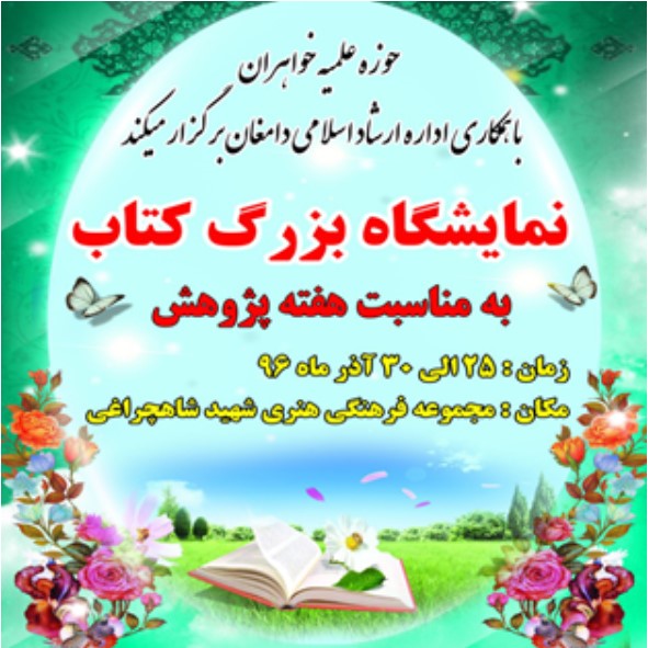 به مناسبت هفته پژوهش، نمایشگاه بزرگ کتاب با همکاری مسئولین حوزه های علمیه خواهران و اداره ارشاد اسلامی شهرستان دامغان برگزار می شود.