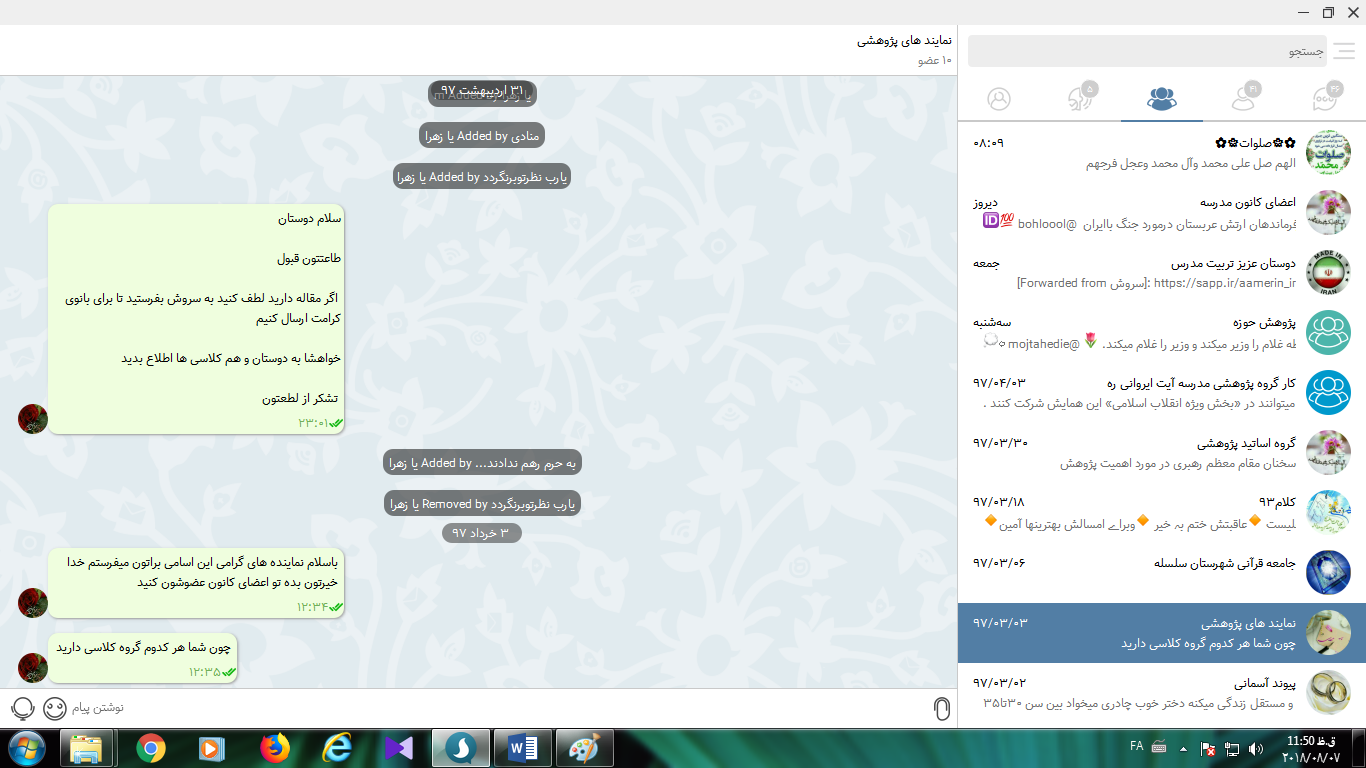 3) گروه نماینده های پژوهشی: جهت اطلاع رسانی سریع تمامی فعالیتهای پژوهشی به طلاب مدرسه این گروه ایجاد شده است.