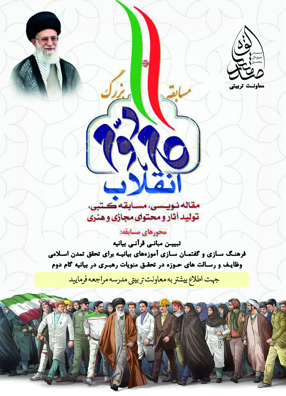واحد فرهنگی مدرسه مشکوه اندیشه تهران در نظر دارد مسابقه ای را به مناسبت صدور بیانیه فخیمه مقام معظم رهبری در تبیین گام دوم انقلاب در قالب مقاله نویسی ، مسابقه حفظ متن بیانیه به صورت کتبی، تولید آثار و محتوای هنری و مجازی برگزار نماید.