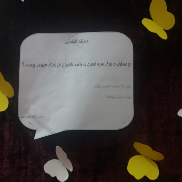 مسابقه «عاشورا ومسئولیت ما »ویژه ماه محرم در مدرسه فاطمیه گرمسار برگزار شد .خانم قندالی کتابدار مدرسه فاطمیه اذعان کرد منبع مورد استفاده طلاب کتاب «حماسه حسینی شهید مطهری ره »است . ایشان افزود از برندگان مسابقه در هفته کتاب وکتابخوانی با اهدا جوایز قدردانی خواهد شد .