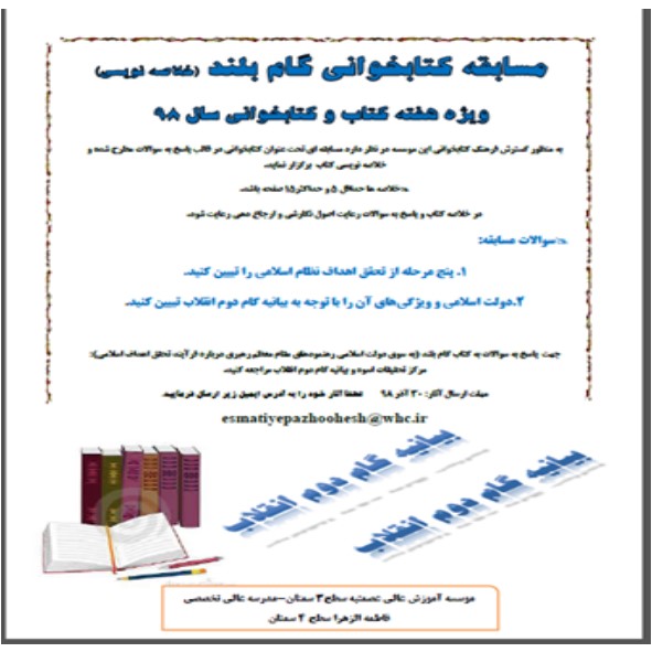 پهلوان بیان کرد: به منظور گسترش فرهنگ کتابخوانی و تمرین در مهارت های پژوهشگری مسابقه¬ کتابخوانی گام بلند ویژه هفته کتاب و موضوع بیانیه گام دوم انقلاب برگزار گردید.