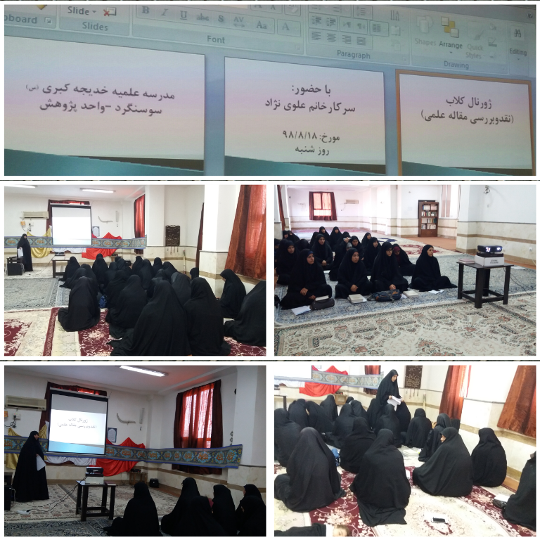 به همت معاونت پژوهش مدرسه علمیه حضرت خدیجه کبری(س) سوسنگرد برنامه ی ژورنال کلاب با حضور سرکار خانم علوی نژاد و طلاب برگزار شد. دراین برنامه مقاله ی یکی از طلاب با عنوان«عوامل سلب توفیق امور عبادی از دیدگاه اسلام» مورد نقد و بررسی قرار گرفت. سرکار خانم علوی نژاد نکاتی که موجب تدوین و نگارش یک مقاله ی علمی می شود را بیان کردند و پس ازآن به نقد علمی مقاله ی مذکور پرداختند. علاوه برآن با هدف مهارت افزایی پژوهشی طلاب، ویژه نامه های پژوهشی بین طلاب توزیع شد. استاد مربوطه پایان برنامه را به پاسخ گویی به طلاب دراین زمینه اختصاص دادند.