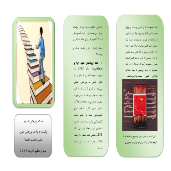 خواجه زاده معاونت پژوهش فاطمیه دامغان گفت :هسته پژوهشي تسنيم وابسته به معاونت پژوهش حوزه فاطميه دامغان به مناسبت هفته پژوهش اقدام به تهيه برشور پژوهشي با هدف فرهنگ سازي پژوهش نمود كه در هفته پژوهش توزيع شد.