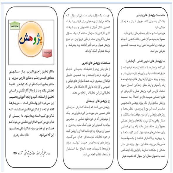 معاون پژوهش نجمیه اظهار کرد: از نظر کاربرد پژوهشها به دو دسته بنیادی و عملی تقسیم میشود که ازنظر هدف؛ پژوهش های بنیادی (پایه، محض)، پژوهش های تجربی (عملی، آزمایشی) و پژوهش های توسعهاي از جمله انهاست .