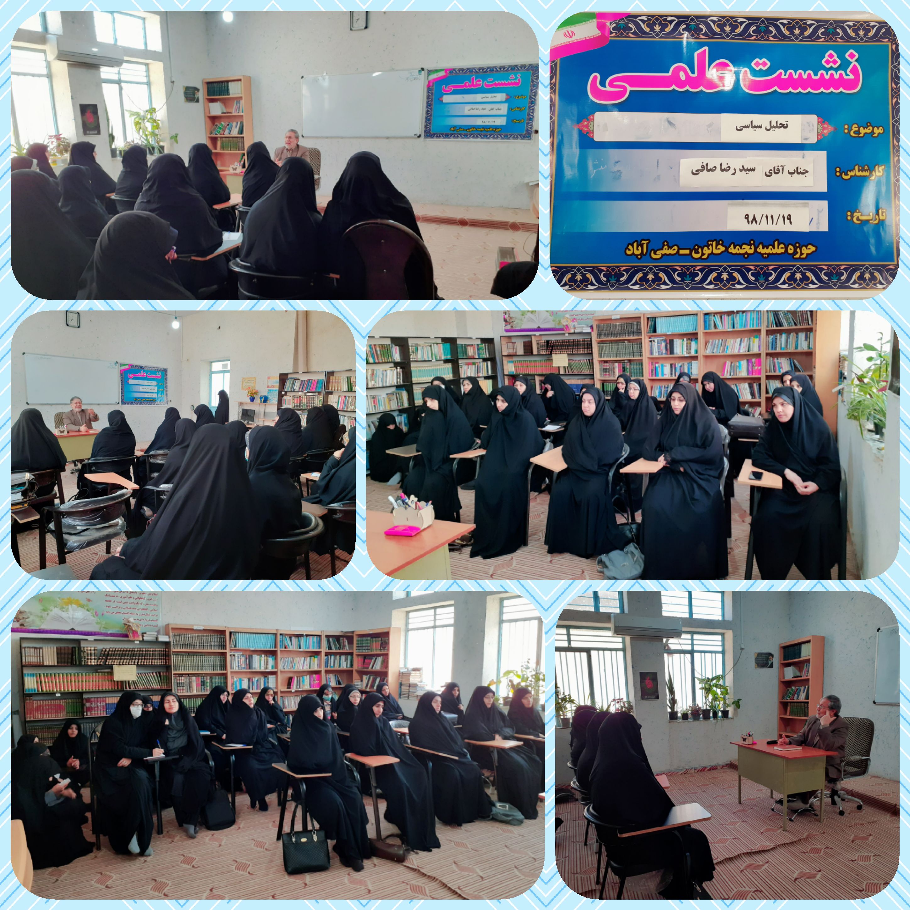 نشست علمی، تحلیل سیاسی مسائل روز به مناسبت فرارسیدن 22بهمن و انتخابات اسفند 98 با حضور جناب آقای سید محمدرضا صافی (سخنران سیاسی)مورخ شنبه 19بهمن در مدرسه علمیه نجمه خاتون صفی آباد برگزار گردید.