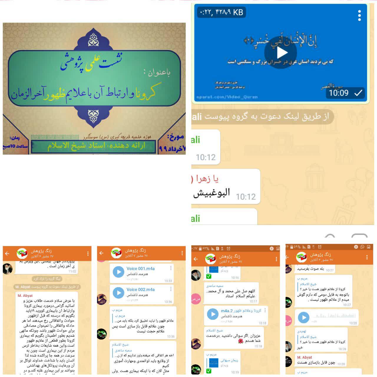 استاد برگزار کننده بحث سرکار خانم شیخ الاسلام در ابتدا نظرات ارسالی طلاب را پاسخ دادند. ایشان در ابتدای مطلب بیان کردند:مرگ سفید که در برخی از نظرات دلیل برعلایم آخرالزمان ذکر شده است ومصداق آنرا بوجود آمدن ویروس کرونا دانسته اند را دلیل بر علایم آخرالزمان نمی دانند. وی اضافه کردند:در کتاب آقای علی کرونی درباره ی مرگ سفید مشخصاتی ذکر شده ازجمله از هر هفت نفر پنج نفر می میرند که چنین چیزی در حال حاضر به دلیل این بیماری محقق نشده است. در نتیجه این بیماری دلیل بر تحقق مرگ سفید که یکی از علایم ظهور امام زمان(عج) می باشد، نمی تواند باشد.