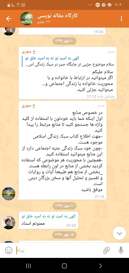 در شرایط کنونی که به علت شیوع ویروس کرونا، دسترسی طلاب به اساتید مقدور نیست معاونت پژوهش حوزه علمیه شهرستان کوهدشت، در راستای پاسخگویی به سوالات طلاب مقاله نویس و رفع ایرادات آنها، اقدام به پاسخگویی به سوالات طلاب در فضای مجازی همچون کانال «کارگاه مقاله نویسی» توسط استادگلاب سوری و استادیار فرشته احمدی که از طلاب برتر پژوهشی مدرسه محسوب میشوند، نموده است. این کانال، در تاریخ 19/5/1398، با سی و دو عضو از طلاب مدرسه تشکیل شده است. از جمله مباحث ارائه شده در راستای پاسخگویی به طلاب، به شرح ذیل است؛