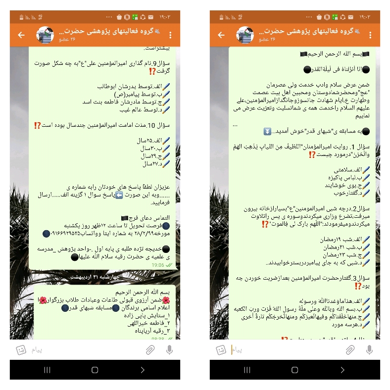 2-مسابقه شب های قدر«10سوال مهم واساسی در رابطه با امام علی علیه السلام وشب های قدر بین طلاب وعموم مردم از طریق شبکه داخلی اجتماعی برگزار شد وبه برندگان به قید قرعه جوایزی اهدا شد.