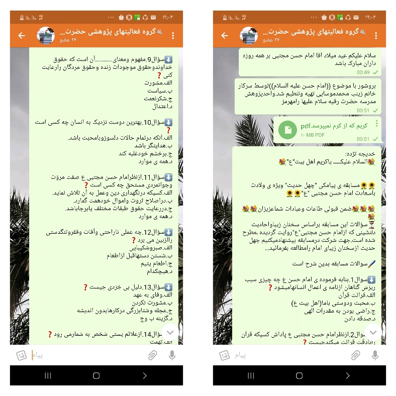 1-مسابقه چهل حدیث امام حسن علیه السلام«این مسابقه در قالب جزوه تایپ شده در شبکهای داخلی اجتماعی توزیع شد وپس از مطالعه با سوالاتی که از جزوه طرح شده پاسخ وبه قید قرعه به برندگاه جوایز نقدی برگزارشد.