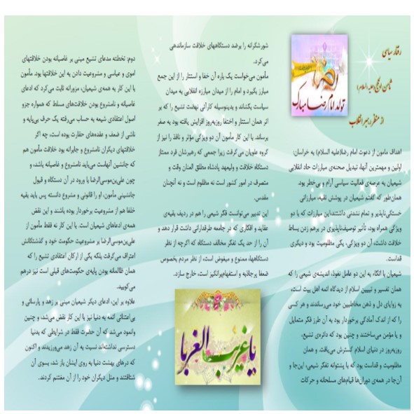 تهيه و تنظيم بروشور با عنوان رفتار سياسي ثامن الحجج(عليه السلام) از منظر رهبر انقلاب وبا استفاده از بيانات مقام عظماي ولايت به مناسبت ولادت با سعادت حضرت رضا(عليه السلام)در مدرسه علمیه حضرت معصومه سلام الله علیها صورت گرفت .