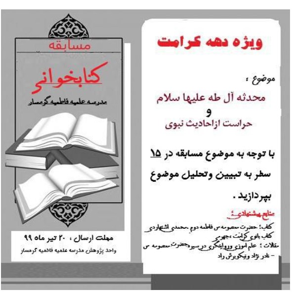 مسابقه پژوهشی به مناسبت دهه کرامت در مدرسه فاطمیه گرمسار برگزار شد .علاقمندان می توانند اثر خود را با توجه به منابع پیشنهادی در ۱۵ سطر با رعایت اصول نگارش علمی تنظیم ودر قالب فایل word به واحد پژوهش مدرسه ارائه دهند . از آثار برگزیده با اهدا جوایز تقدیر خواهد شد .