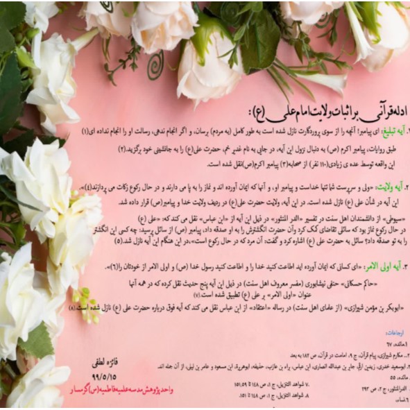 به مناسبت عید سعید غدیر خم محتوای پژوهشی با موضوعات ادله اثبات ولایت امیر المومنین علی علیه السلام با همکاری اعضای کانون مدرسه فاطمیه گرمسا رتهیه ودر گروه های مجازی توزیع شد .