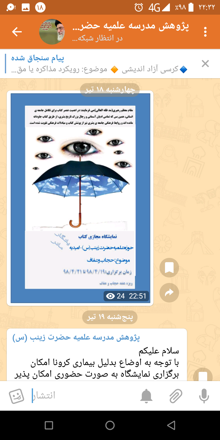 این نمایشگاه به مناسبت هفته حجاب و عفاف و ترویج آن در تاریخ 81 تا 18 تیر سال 8911 در کانال ایتا برای طلاب مدرسه علمیه حضرت زینب)سلام الله علیها (برگزار شد . به این صورت که هر کتابی که معرفی می شد فایل پی دی اف ؟آن نیز رایگان در اختیار طلاب قرار داده می شد.و پایان هر روز تعداد نرم افزار و اپلیکیشن کتاب در اختیار آنهار قرار داده می شد.