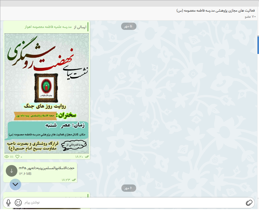 به مناسبت هفته دفاع مقدس مدرسه فاطمه معصومه (س) اقدام به برگزاری نشست سیاسی با موضوع نهضت روشنگری نمود،این نشست به صورت مجازی در گروه فعالیت های پژوهشی مدرسه برای طلاب غیرحضوری ارسال شد.