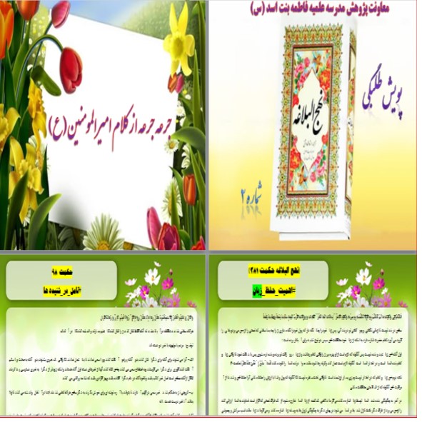 به گزارش معاونت پژوهش مدرسه علمیه فاطمه بنت اسد (س) بسطام در مورخ 9/7/1399 بروشور جرعه جرعه از کلام امیر المومنین (ع) شماره 2 تهیه و در بین طلاب و در فضای مجازی توزیع شد .در این بروشور 2 حکمت از نهج البلاغه بیان گردیده است .