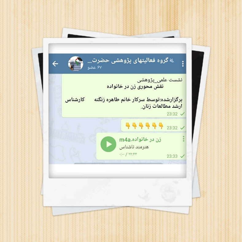 نشست علمی- پژوهشی با عنوان: «نقش زن در کانون خانواده»، این نشست توسط سرکار خانم طاهره زنگنه کارشناس ارشد روانشناسی زنان بصورت صوت در گروه پژوهشی ایتا برگزار شد وطلاب نهایت استفاده رو از این سخنرانی کردند