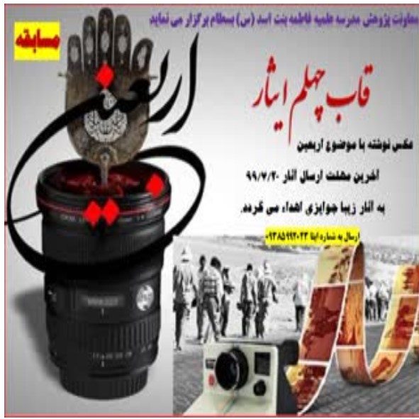 به گزارش معاونت پژوهش مدرسه علمیه فاطمه بنت اسد (س) در مورخ 14/7/1399 مسابقه قاب چهلم ایثار به مناسبت اربعین حسینی اجرا گردید .