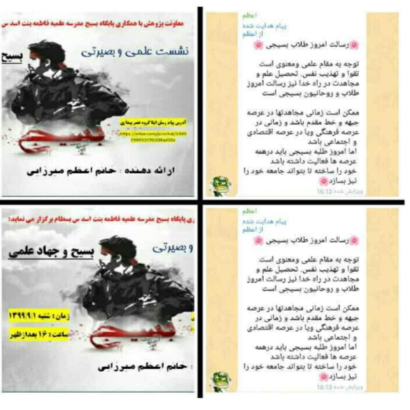 به مناسبت هفته بسیج معاونت پژوهش با همکاری پایگاه بسیج مدرسه نشست علمی و بصیرتی با عنوان بسیج و جهاد علمی در پیام رسان ایتا گروه عصر بیداری برگزار گردید .