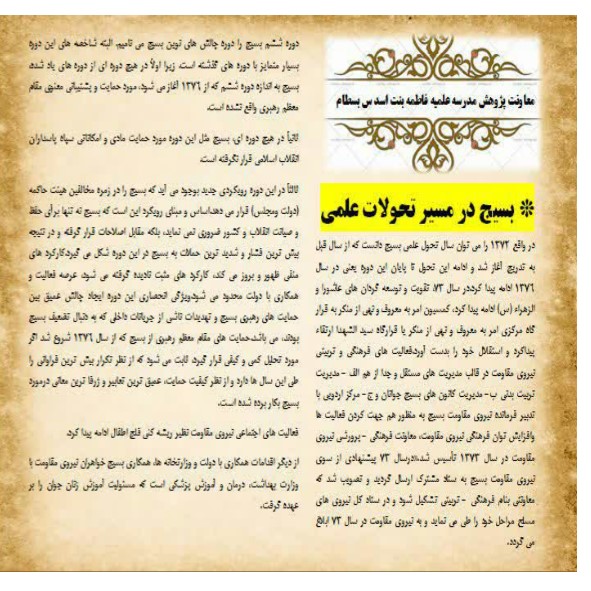 به گزارش معاونت پژوهش مدرسه علمیه فاطمه بنت اسد س بسطام در مورخ 1399.9.2بروشور « بسیج در مسیر تحولات علمی » به مناسبت هفته بسیح تهیه و در بین طلاب توریع گردید . در این بروشور از آغاز شکل گیری بسیج تحولاتی را که در مسیر علمی داشته به اختصار بیان کرده است.