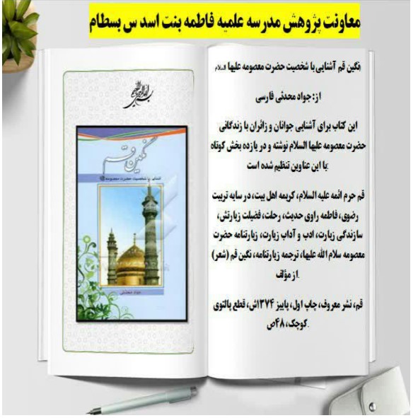 به گزارش معاونت پژوهش مدرسه علمیه فاطمه بنت اسد س بسطام در مورخ 1399.9.5به مناسبت وفات حضرت معصومه س معرفی کتاب ''نگین قم ''اثر..جواد محدثی در گروه های مجازی مدرسه فاطمه بنت اسد بسطام انجام شد .