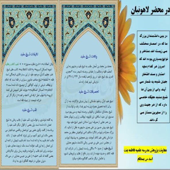 به گزارش معاونت پژوهش مدرسه علمیه فاطمه بنت اسدس بسطام در مورخ 99.9.9 به مناسبت روز بزرگداشت شیخ مفید ره بروشوری تهیه و در بین طلاب توزیع گردید.