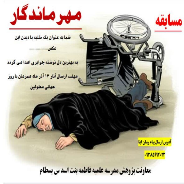 به گزارش معاونت پژوهش مدرسه علمیه فاطمه بنت اسد س بسطام در مورخ 99.9.11 به مناسبت روز جهانی معلولین مسابقه ای با عنوان مهر ماندگار و با شعار معلولیت خود را با فکرم جبران می کنم برگزار می گردد.در این مسابقه دل نوشته کوتاهی متناسب با عکس نوشته شود.