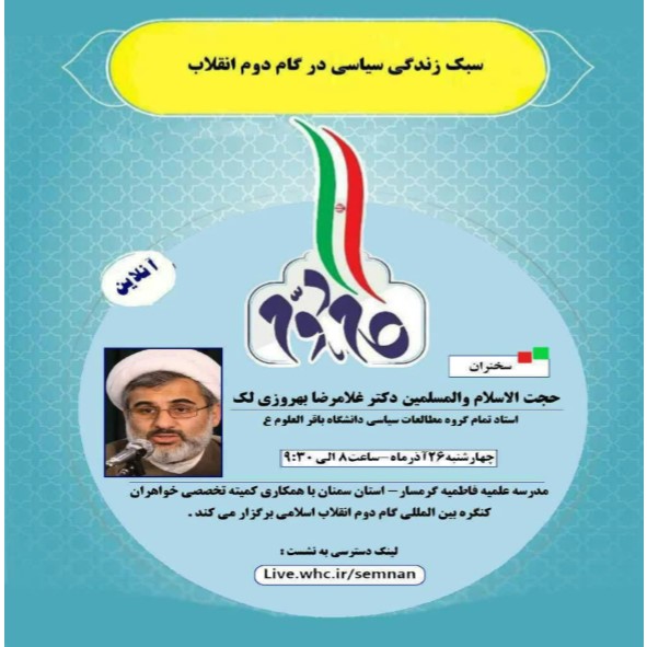 به مناسبت هفته پژوهش مدرسه علمیه فاطمیه گرمسار با همکاری کمیته تخصصی خواهران کنگره بین المللی گام دوم انقلاب اسلامی از منظر قران وحدیث برگزار میکند. به گزارش معاونت پژوهش مدرسه علمیه فاطمیه گرمسار پیش نشست ؛ "سبک زندگی سیاسی در گام دوم انقلاب اسلامی" با حضورارزشمند حجت الاسلام والمسلمین دکتر غلامرضا بهروزی لک استاد تمام گروه مطالعات سیاسی دانشگاه باقر العلوم ع ، همزمان با هفته پژوهش در روز چهارشنبه ۲۶ آذر ماه ساعت ۷:۴۵ به صورت آنلاین برگزار میشود .